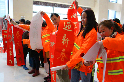 “春滿人間百花吐艷 福臨小院四季常安” “一帆風順年年好 萬事如意步步高” ……1月26日至28日,麗匯大廈一樓熱鬧非凡,為了感激社會各界對綠港集團的關心與支持,由綠港集團工會組織的書法家“迎新春 送祝福”義務送春聯(lián)活動吸引了大量前來求墨寶的社會各界人士。三位南寧市書法協(xié)會的書法家以及南寧科巨公司副總經理陸章發(fā)為觀眾們現(xiàn)場揮毫,一幅幅金燙燙、散發(fā)著墨香的春聯(lián)映襯著人們的笑臉,整個現(xiàn)場彌漫著濃濃的年味,短短三天時間便送出了2000多副春聯(lián)。1月26日上午,綠港集團工會還啟動了派送春聯(lián)儀式,綠港集團工會主席黃麗琴帶領工會人員將春聯(lián)送到經開區(qū)40余位保潔人員、園林綠化工人、公司職工的手上。(張彩秀/文、圖)