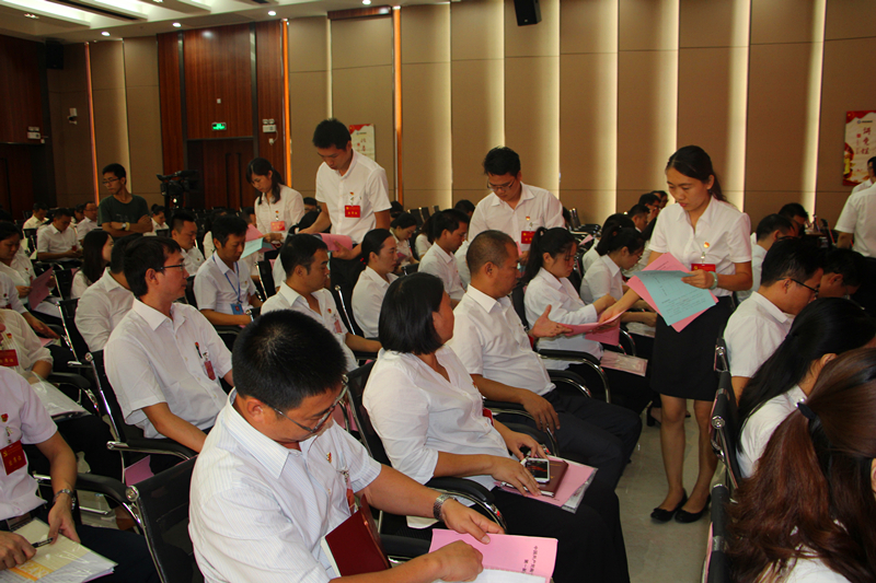 上午八點十分,大會全體工作人員提前到位,大會籌備會務(wù)組人員整齊地擺放好簽到表、出席證、嘉賓證和列席證,做好迎接大會的準(zhǔn)備。計票人、監(jiān)票人會前碰頭,明確分工任務(wù)。