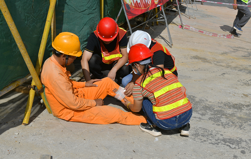 現(xiàn)場模擬一名工人在2#、3#廠房間的廊架上進(jìn)行施工作業(yè)時(shí),因未系安全帶、腳下未踩穩(wěn)造成高處墜落受傷,其他人員對(duì)其進(jìn)行急救的情況。從發(fā)現(xiàn)人員墜落受傷、疏散人群、封鎖現(xiàn)場到對(duì)受傷人員骨折部位用夾板進(jìn)行固定再送至醫(yī)院,僅歷時(shí)10分鐘。整個(gè)過程緊張有序,應(yīng)急處理得當(dāng)。演練中,現(xiàn)場每名救援人員嚴(yán)肅認(rèn)真對(duì)待每個(gè)演練細(xì)節(jié)。各應(yīng)急小組聞聲而動(dòng),各司其職,反應(yīng)迅速,各環(huán)節(jié)無縫銜接,使救援任務(wù)得以順利完成。